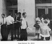 Minutes later, Oswald was seen "ducking into" the entrance alcove of a shoe store, apparently avoiding passing police cars. Soon after, the store's manager saw Oswald slip into the nearby Texas Theater without paying.[104] He alerted the theater's ticket clerk, who telephoned police.[105]