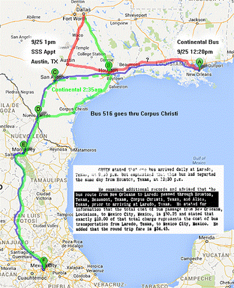 Hang on a second now... a 12:20pm bus to Houston huh... On Dec 16, 1963 Mr. Major Green of the CONTINENTAL TRAILWAYS bus line stated that there were two (2) buses that traveled from New Orleans to Laredo. (One might assume that if Oswald was going all the way to Mexico he would buy a bus ticket for the entire trip as opposed to simply traveling to Houston and buying yet another ticket there for the rest of the trip.) These buses were the 4:40pm and 8:15pm Sept 25th buses arriving in Houston the next day, the 26th, at 2:15am and 7:00am, respectively. (WCD183) The 2:15am arrival would have been just in time for the 2:35am from Houston to Laredo... The FBI looked into the 4:40pm bus, its driver and passengers with no indication that Oswald was aboard.