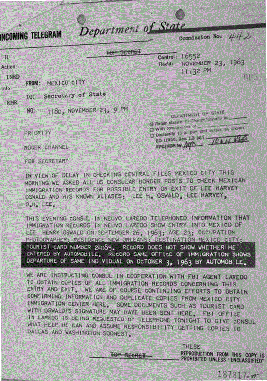 Surely there are records kept as tourists leave the USA and enter a different country. The stamping of passports is something we can usually count upon yet in 1963 traveling to Mexico or Canada did not always result in these stamps. So what else can we find which would show that Oswald, with no known nefarious thoughts at this point, left the US for Mexico. Surely he was not actively trying to hide this travel; given the discussions Marina claims they had about the trip, the lack of any motive and the ease with which he befriends others on the way.