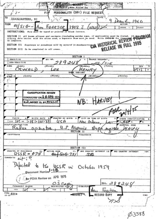 This is not the first time Lee "HENRY" Oswald is referred to related to Mexico City. The saga of Lee Henry begins with Ann EGERTER of Angleton's CI/SIG unit who, on Dec 9, 1960 submitted a 201 file request (for people the CIA takes an active interest in as either being a threat or asset) which offers no other name aliases for Lee Henry Owsald. Given that we, the Navy, the CIA, State and FBI have seen his military records, "Henry" was no simple mistake or oversight... it appears purposeful and resurfaces in connection with correspondance to and from Mexico's station chief Win Scott. We will be discussing the evidence which was generated after the visit in the final part of the this series.
