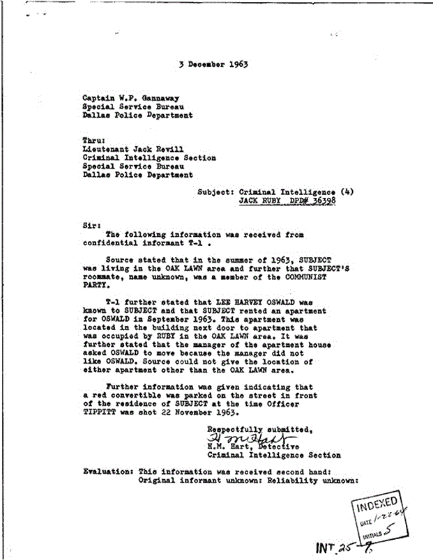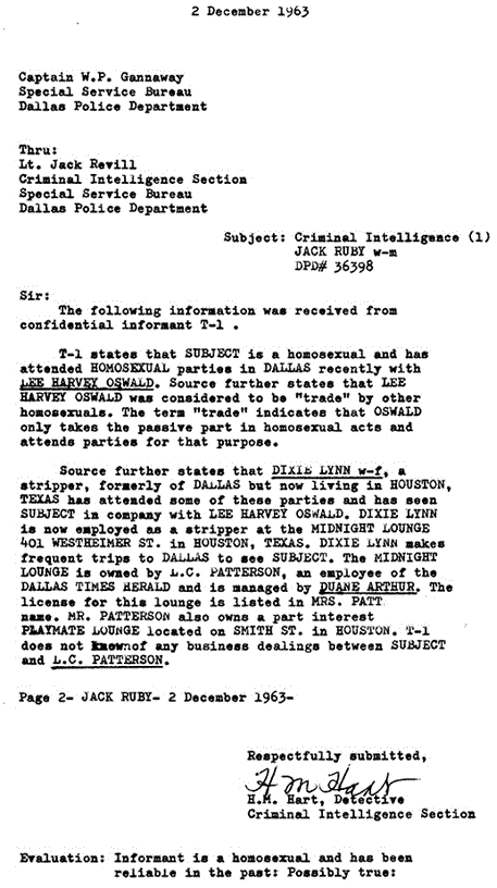 Detective Hart, through Reville to Gannaway writes that, via a previously trusted informant, Ruby, as well as the man known in Dallas that summer as Lee Oswald, were homosexual and ran in those circles at least in Dallas. Of course, the homosexual aspect of the case also surfaces in New Orleans with Shaw and Ferrie and yet again in Irving when Oswald is repeatedly seen in the company of a young boy in the weeks leading up to Nov 22nd.