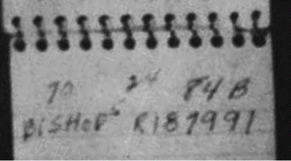 (Ruby's notebook with BISHOP RI8-7991. A "Bishop" was not found to be either a first or last name among those who Ruby knew)