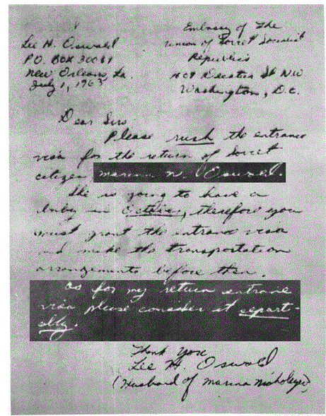 Lee Harvey (or Henry ala CI/SIG) Oswald; whose plans about the assassination the WCR says was not related to this trip--decided to go to Mexico City in order to secure passage thru Cuba to Russia. For months his wife was writing the Russian Embassy, including a questionaire, pleading to get back to Russia; with or without her husband (CE 6-2/17; CE 9-3/17; CE 12-undated questionaire & CE 14-7/8. Even her husband joined in the effort: CE 13 7/1/63: