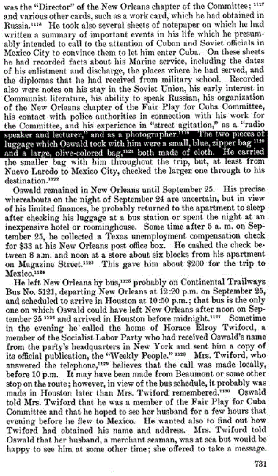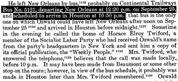Returning to September 25th, there is no mention of the transportation needed to get Oswald from the downtown bus station area back to his PO Box or to the Winn Dixie and then back again to leave on the 12:20pm bus to Houston; the ONLY bus that fits the WCR description of his travel. The problem the WCR could not overcome yet chose to add in their narrative on p.731 posted above is Oswald's evening call to the Twiford's in Houston and the affidavit of Mrs. Twiford.