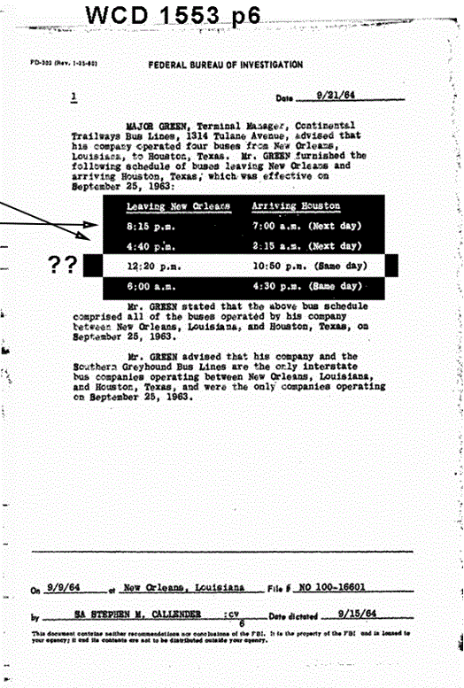 On September 21, 1964, almost 10 months later and only a few days before the presentation of the WCR, an FBI report which becomes WCD 1553 (and accompanies a letter from Hoover dated Nov 9, 1964; after the WCR is delivered) was written up. This is from a September 9, 1964 re-interview of Mr. Major Green by FBI agent Callender in New Orleans. In THIS report, Mr. Green adds two more buses which travel from NOLA to Houston at 6:00am and 12:20pm arriving in Houston at 4:30 pm and 10:50 pm, respectively. The WCR places Oswald on the 12:20pm bus #5121 which arrives in Houston at 10:50 pm since it is known that Oswald retrieved and cashed his $33 unemployment check down the street from his apartment at 4905 Magazine after the 6am bus had already left New Orleans (even though this check was unsigned).