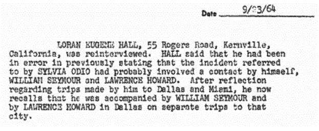 On 16th September, 1964, FBI agent Leon Brown interviewed Loran Hall on behalf of the Warren Commission. Brown claims that Hall admitted that he, Lawrence Howard and William Seymour made a visit to a woman who could have been Silvia Odio. However, when Hall was re-interviewed on 20th September and was shown a photograph of Odio, he claimed she was not the woman he met in New Orleans.