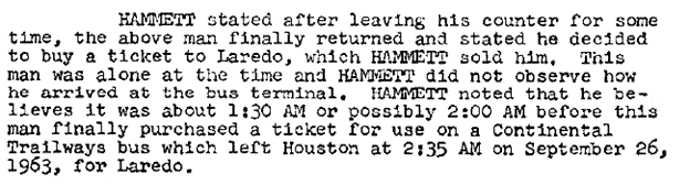 Mr. E.P. HAMMETT, the ticket agent at the Continental Trailways counter in Houston on the night of Sept 25th remembers distinctly selling a single ticket for travel from Houston to Mexico City; a rare event as that trip's tickets are not sold but more than 1 or so a week, according to Mr. Hammett. In this report the FBI shows Mr. Hammett a photo of Oswald and a small Zipper bag (but not the larger olive-colored canvas bag which is ultimately recorded on the Nuevo Laredo to Monterrey, Flecha Roja busline portion of the trip.