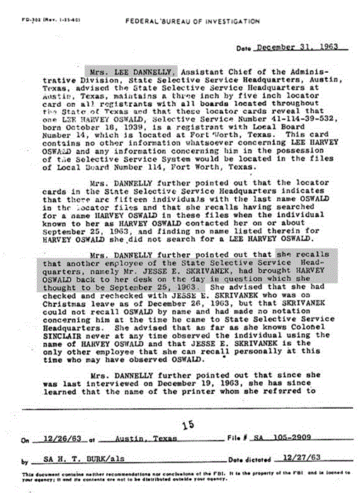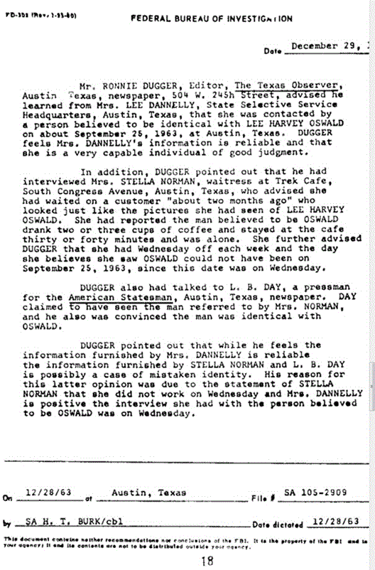 To avoid corroborating her story we find the FBI once again trying to discredit witnesses. While they all give Mrs. Dannelly (and Jesse Skrivanek) the benefit of the doubt, they determine that two more people could not be right. One of these witnesses, a waitiress who claims to have served Oswald stated she had Wednesdays off. Sept 25th was a Wednesday and it was the day Mrs. Dannelly saw Oswald, so by process of elimination Mrs. Norman could not have seen Oswald. When shown a photo of Oswald, both Ronnie Dugger and Mrs. Stella Norman claim the person they met was "identical with Oswald."