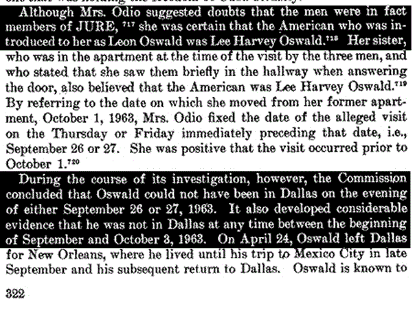 The powers that were/are in charge of the evidence made sure that Ms. Odio's story was not heard in a timely manner. Her WC interview was in mid July 1964 while the FBI reports, CE3147 & 3148 are dated September 1964. The report itself was finished and delivered on September 24, 1964. Ms. Odio's story is summarized on pgs. 321-322, followed by the declaration that since OSWALD was traveling on a bus to Mexico at the time he could NOT have been at Odio's home in Dallas at the same time and it has been developed "that he was not in Dallas any time between the beginning of September and October 3, 1963." Until the Hearings and Exhibits were published, this was the only mention of Sylvia Odio, 2 Cubans and Leon Oswald.