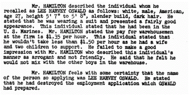 Mr. Olin Hamilton of the AL SEMTNER Drug Dept in Dallas was reported by the FBI to have interviewed LEE OSWALD just after Sept 23, 1963; when the WCR tells us he was not in Dallas during that time. Much like the WCR's statement that no one saw Oswald between 11:50 and 12:30 on 11/22, the above declaration that Oswald was not in Dallas at all in the month of September is easily disproved. Oswald was in New Orleans all summer, so one wonders how the Texas Employment Commission has recent Dallas information on this man, and is able to send him on this interview.