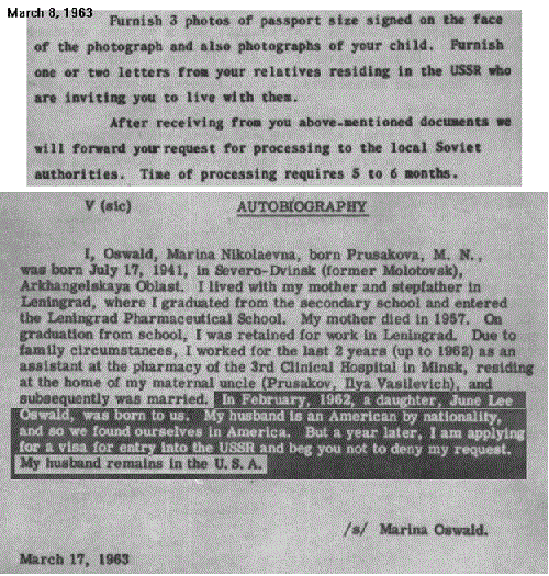 and again in CE 15 on 11/9/63 (although this typed letter may be a creation of Ruth Paine's: typed letter from Irving.) In response to Marina's Feb 7 letter, the Russian Embassy replied CE-8 with specific instructions on how to accomplish the process and that once a completed application and questionaire was received it would take 5-6 months.