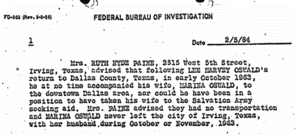 Mrs. Ambrose Martinez told the FBI that prior to the assassination in Aug/Sept Lee and Marina and 2 children visited her Salvation Army welfare office in Dallas. (at 500 N Ervay not far from the FBI offices in Dallas at the time) She gave the FBI details related to their references to Mrs. Paine and Marina only speaking Russian. Lee told her they were living in Irving with Mrs. Paine and that he had met her in New Orleans. Ruth, on the following page mentions that Marina never went to downtown Dallas after Oswald joined them on October 3rd. Furthermore, Oswald's 2nd child was not born until mid-October.