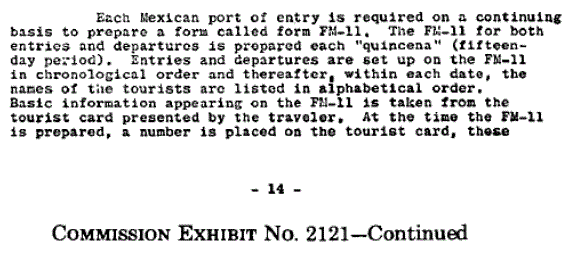 CE2121 p14-15 & 23; From Mexican Immigration forms FM-5 and FM-8 (this FM-8 appears imprinted at the top of the tourist visa card #24085 made out to Harvey Oswald Lee) the FM-11 form is created which is an alphabetical listing of those entering Mexico prepared every 2 weeks. For those people entering the 1st of the 15-day cycle, the person with the first alphabetical listing would have the #1 written on their visa and they'd be recorded on line #1 in the FM-11.