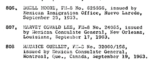 On page 23 of CE2121, after the name Buell Moore and before Maurice Ouellet we have "HARVEY OSWALD LEE, FM-8 #24085." Except according to the Mexican officials, they believed the passenger's name from the visa was Lee, Harvey Oswald which becomes "H.O. Lee" on his departing documents. LEE comes well before MOORE. In fact, Mr. LEE should have been #800 before Mr. Mason. One has to wonder who in Mexico would have known this passenger to be Mr. OSWALD when preparing this list as opposed to Mr. LEE as stated by his travel documents.