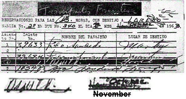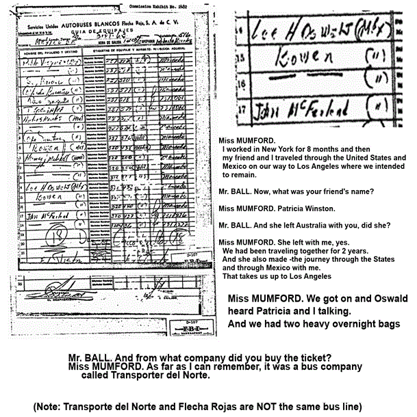 There is no record of his travel from New Orleans to Houston. No record of a ticket from any mode of transportation; the FBI checked. There is a record of a bus ticket being purchased in Houston by 2am which should have covered Oswald's travel from there to Mexico City (FBI report of SA Edwin Dalrymple, 2/20/64). There are the affidavits of Mr. & Mrs. McFarland (McFarland) and the testimony of one of two Australian women; Pamela Mumford (Mumford); who, with Patricia Winston, spoke with the man who called himself Lee Oswald after the women boarded in Monterrey and continued on to Mexico City. And finally, as the only physical proof of the trip itself, the Flecha Rojas (Red Line) baggage manifest: