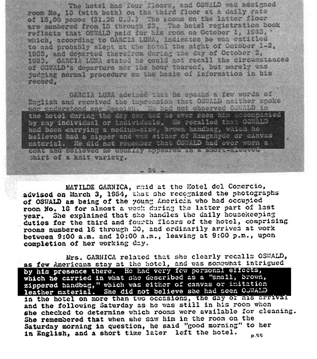 In Mexico, the FBI asked Hotel personnel what they remembered about the young American visiting them; the only American staying at that hotel we may add - CE2540 contains some of these interviews. Both the Front desk clerk and the maid handling Oswald's room state he only had one, small brown bag and not the two bags, one blue and one green that Mr. Rogers sees Harvey leave with and board a downtown bus: