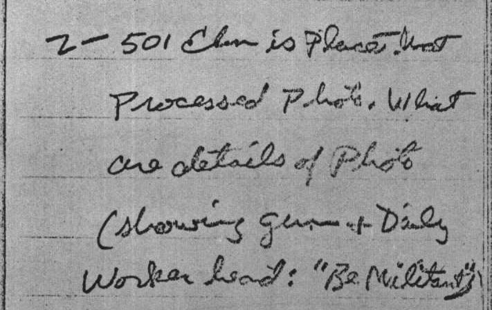 The link of the alleged murder weapons with the suspect, although more tenuous than initially portrayed, was publicized as a major breakthrough and helped harden opinion that Oswald was the assassin ahead of his own murder. The presence of radical left wing literature in the photos also helped solidify a portrait of Oswald as a dangerous communist. Curry’s misreading of a newspaper banner - Be Militant instead of The Militant - is indicative of a particular frame of reference, and explains a note jotted by reporter Seth Kantor: “Ask Fritz ... 501 Elm is place that processed photo. What are details of photo (showing gun & Daily Worker head: “Be Militant.” (CE Kantor 3)1