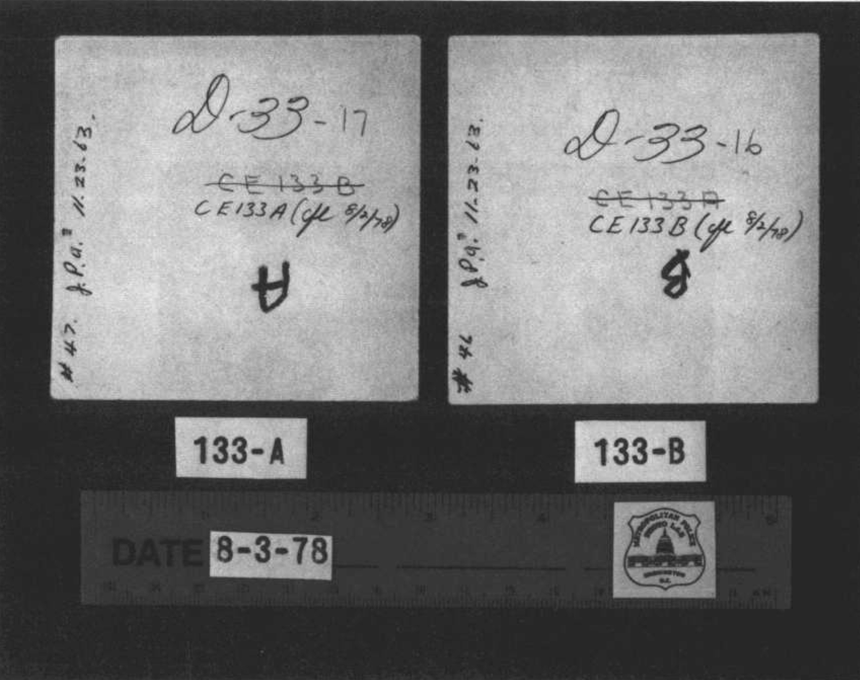 2 The original negative of 133-A went missing while in the possession of the Dallas Police department. It would later be claimed (i.e. First Day Evidence) that only one negative was found at the Paine residence, and that the copies disseminated by the Dallas Police were generated from the two prints, not the negative(s). However, it is hard to get around the clear ID of two negatives made by the officers who found these photos, and the Identification Bureau paperwork from 4:30 PM which unambiguously records two negatives.