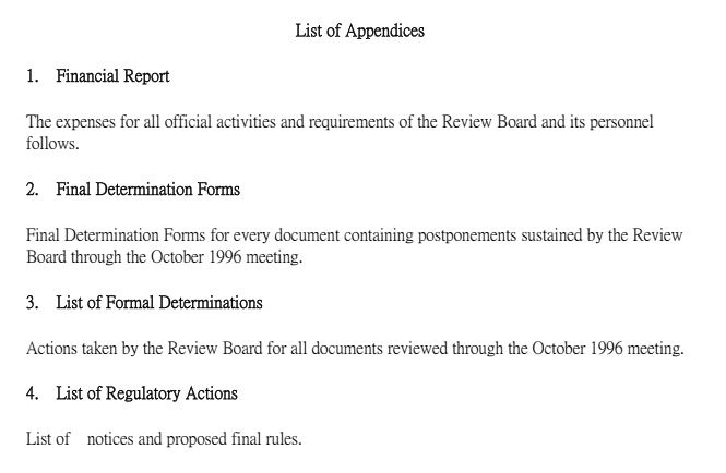In regard to the ARRB Annual Report for Year 1996, all available draft versions of the 1996 Report include in the List of Appendices separate appendices for both 1. Final Determinations and 2. Formal Determinations, as shown in the example below.