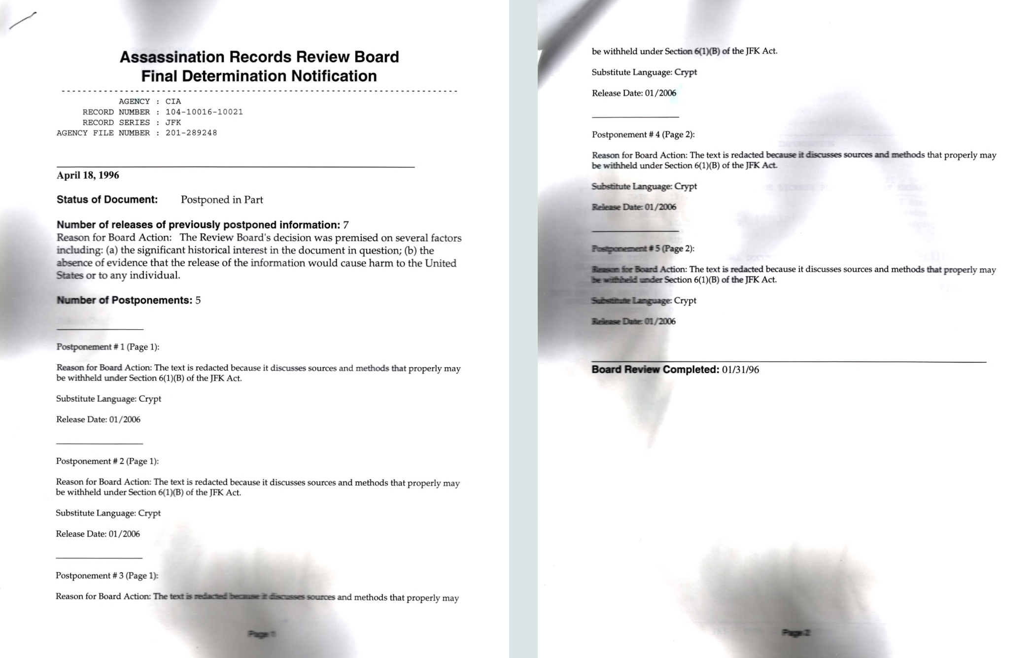- Issuing full written detailed Final Determination orders showing the ARRB’s reasons for their final decisions under the standards of the Act where agencies sought postponement; and