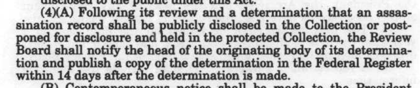Section 9(c)(4)(A) of the JFK Records Act [below] required the ARRB to publish copies of each of their determinations in the Federal Register within 14 days of issuing the determination. A sample of a Federal Registry notification of Formal Determinations is attached here. As you can see, these are very streamlined and simple notices that only display the name or the agency that originated the record, RIF#s, number of postponements, and the date on which either Periodic Review or Release of the record was ordered by the ARRB. As explained in Part One, Formal Determinations are not Final Determinations, as they lack the detailed reasons for declassification decisions and the precise orders for periodic review or the release of records.