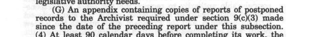 Section 9(f)(3)(G) [below] specifically required the ARRB to include in each Annual Report an appendix containing copies of all of the Final Determinations issued during the calendar year of the Report. This is important because the Annual Reports were intended to show the actual work of the ARRB annually on postponement requests made by government offices and agencies. These Reports were to be made fully available to the public.