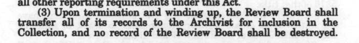 IMPORTANT NOTE: The “reports” required to be sent to the Archivist under 9(c)(3) (as mentioned in section 9(f)(3)(G)) were the only notifications wherein the ARRB was required to include all of the detailed written reasons for each postponement, the activities of the ARRB and the ordered date or occurrence for the triggering of periodic review or release of the record. 9(c)(3) “Reports” are the ARRB Final Determinations and the ARRB had a mandatory and non-discretionary duty to issue a Report every year during its operations that included an Appendix containing copies of all Final Determinations that it had issued during the year of the Report. Copies of the Reports were to be sent to the leadership of the Congress, the Committee on Government Operations of the House of Representatives, the Committee on Governmental Affairs of the Senate, the President, the Archivist, and the head of any Government office whose records have been the subject of Review Board activity.