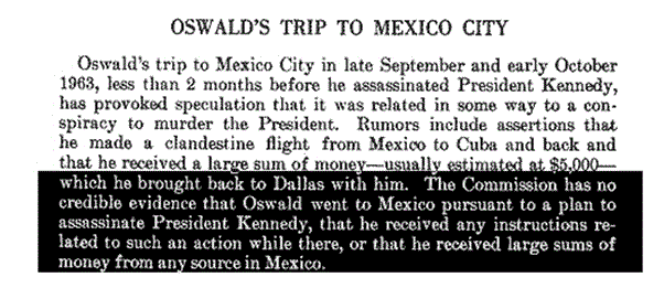 How can we establish a relationship between Oswald's decision to go to Mexico and the way in which it was reported within the government, and Oswald's guilt for the JFK assassination? The WCR claims there was no connection whatsoever between the events to and from Mexico (as well as the time in Mexico) to Oswald's plan to kill JFK. The Warren Commission Report's conclusion reflects that the Commission determined that there was little if any advanced planning of the assassination. At least on Oswald's part.