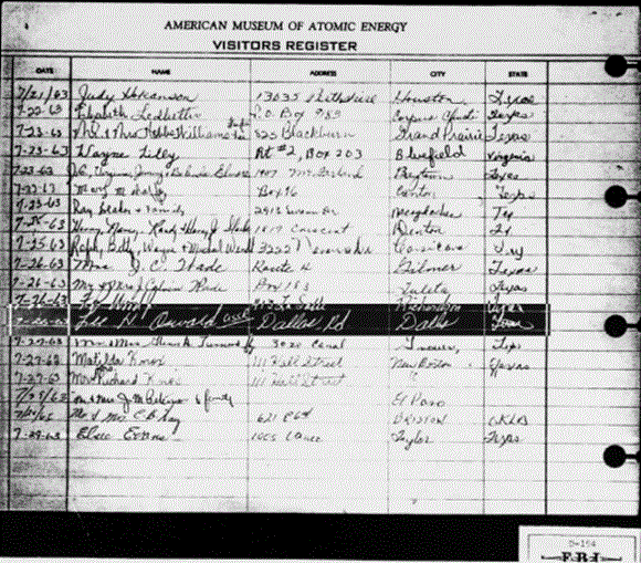 In the time period when Oswald actually stopped working at Reily Coffee on July 22, 1963 (a company employing Oswald with its own set of CIA, FBI and NASA coincidences and peculiarities) and Sept 23, 1963 Oswald did not work, officially; his only job while in New Orleans since April was at Reily. In yet another of a long line of imposter coincidences, on July 26, 1963 at the American Museum of Atomic Energy in Tennessee we find someone has signed Oswald's name and associated him with the USSR and Dallas. (H&L p.551 - FBI D-154)