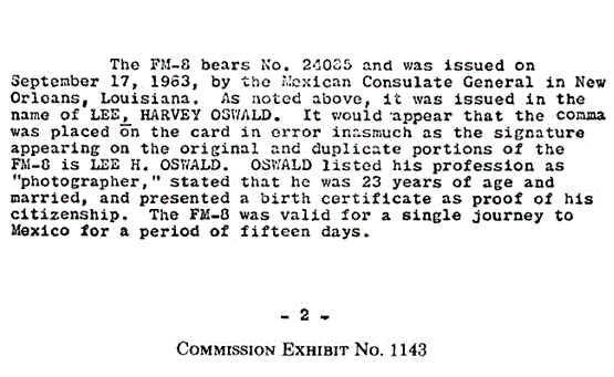 The above excerpt starts with acknowledging that the 15 day visa was made out to "LEE, HARVEY OSWALD" comma and all, yet they write: "It would appear that the comma was placed on the card in error inasmuch as the signature appearing on the original and duplicate portions of the FM-8 is LEE H. OSWALD." As we can see, #24085 appears as described (this is a reversed image) as do the signatures...
