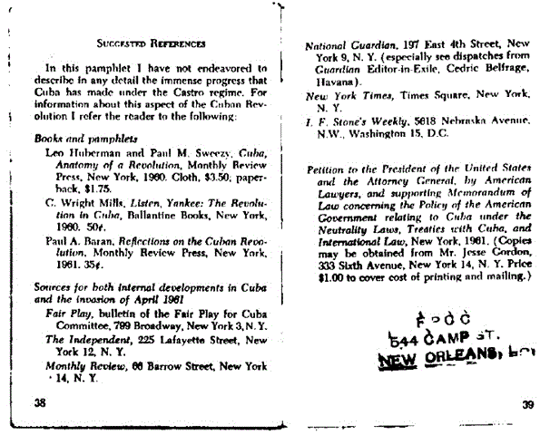 CE3120 shows copy of Corliss Lamont's pamphlet with the final page bearing a FPCC, 544 Camp Street, New Orleans stamp. WCD1495 is a SS report dated Sept 11, 1964 which connects this pamphlet to literature found in Oswald's possession.