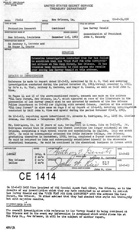CE1414 is an SS report from Dec 1963 which concludes that there was no connection between FPCC and 544 Camp, and that it was "impossible" to find anyone who recalls ever seeing Oswald at that address. But boy oh boy did we try hard.