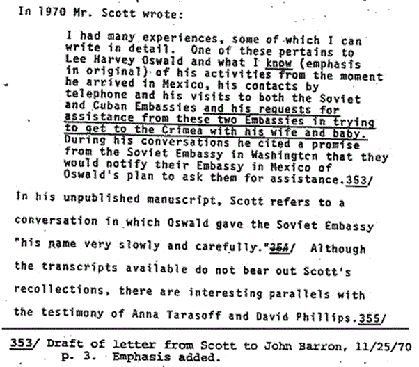 The evidence tries to establish that Oswald was focused on getting to Cuba en route to Russia and that he had met with a man supposedly KGB assassination related, although Win Scott claims Oswald was trying to get to Odessa with his family and little else. Win also states to his knowledge, as he was not in Mexico at the time, that Oswald was under complete and thorough surveillance the entire time he was in Mexico. He could only get this information from one of the two people overseeing the Mexico station in his absence: Anne Goodpasture, his chief assistant and/or David Atlee Philips; Head of the Cuban desk at the Mexico station.