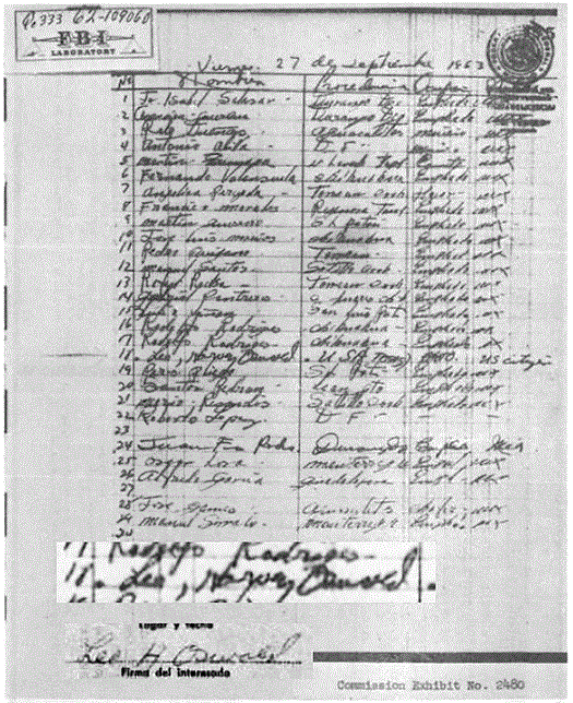 The following is A COPY of the Mexican Hotel's guest register with a blow-up of the signature compared to the signature on the visa. (ALL docs are copies as the FBI took possession of and kept all originals. As time passed and originals were requested, we find that most originals were either destroyed, or claimed to be lost. Whether the CIA/DFS turned over all the docs is yet another difficult to resolve mystery).