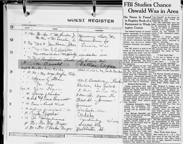Looking at a list of WCR/FBI Exhibit numbers we spotted FBI D-050, a guest registry for the Fox and Hound in Milwaukee, WI with the name LEE OSWALD; DALLAS, TEXAS signed on the registry page for Sept 14, 1963. The article states the date was Sept 16, even though the actual page does not appear to have a date at all. A report of a "Lee Harvey Oswald" also written in a restaurant registry in Hubertus, WI coincides with a statement from the article by Mrs. Patricia Stanley, manager of the Fox and Hound, "...declined to comment on how the FBI learned that the registry contained the name of 'Lee Oswald'" ..." I am not at liberty to say anything." Asked whether the FBI had instructed her not to comment Mrs. Stanley replied, "There were others, too, but I just can't say."