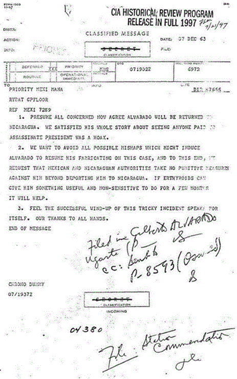 CE 3152 continues by establishing that Alvarado was informant T-32, that he was 60% sure it was Oswald and that it occurred on the 18th of September. In conjunction with this is a follow-up memo (possibly from David Phillips) which discusses "resolution" of the Alvarado issue yet gives the distinct impression that Alvarado, his employer and the CIA are very much intertwined. We'll delve more deeply into the Alvarado incident in part two. Note: "IF ERTHYROIDS CAN GIVE HIM SOMETHING USEFUL AND NON-SENSITIVE TO DO FOR A FEW MONTHS IT WILL HELP." His job in Mexico was most assuredly "sensitive."