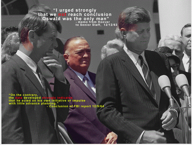 "...I think we have a very, very close plan. Now if we can identify this man who is at the Mexican Embassy at; the Soviet Embassy in Mexico City, the Embassy in Mexico City -- this man Oswald has still denied everything." Hoover would feel and mention the sting of the CIA and Oswald in Mexico for many years to come. He would also make clear to his staff that he felt the FBI report mistakenly came to a conclusion. The Commissioners themselves were very surprised at this since Hoover was given to saying the FBI determined the facts and did not present conclusions, even if ironclad.