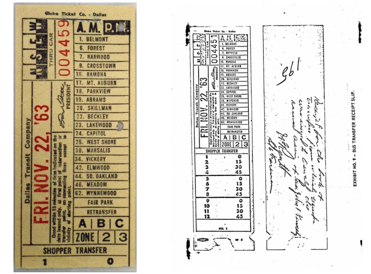 A bus transfer is a form of ticket issued when a passenger breaks a journey, enabling a follow-up journey on another connecting bus line, without paying another full fare. According to McWatters’ Warren Commission testimony, a passenger had to give a reason for getting a transfer.