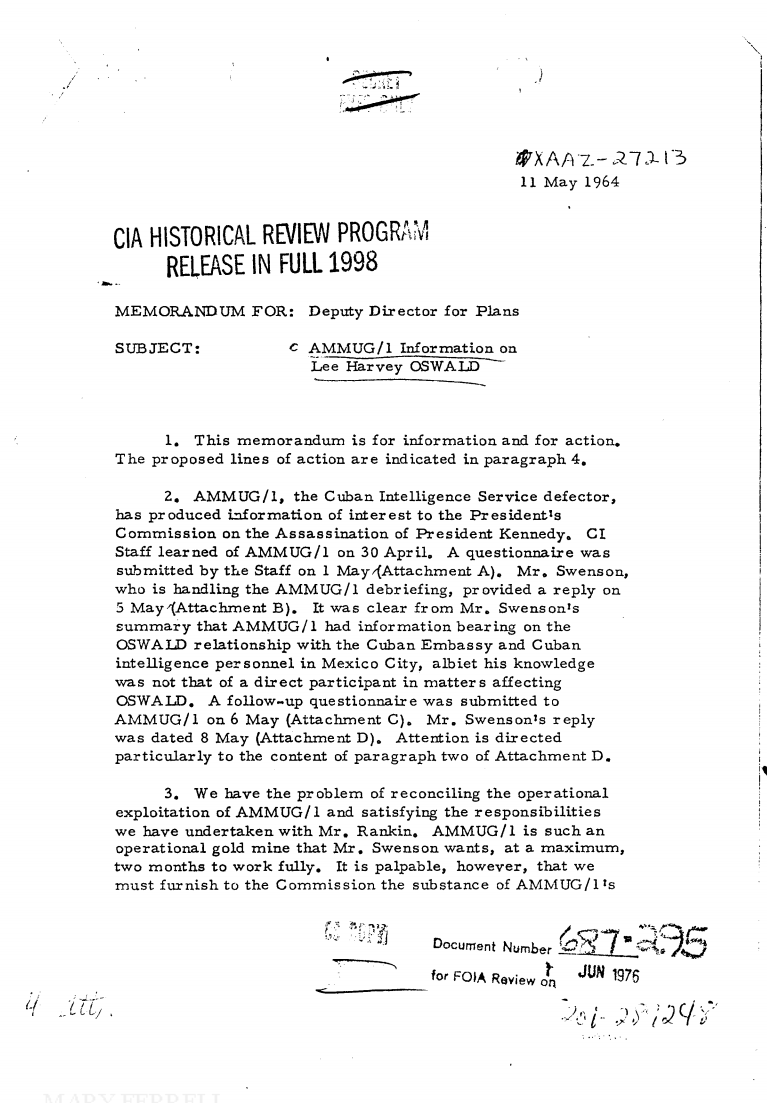 By May 8, 1964, the CIA realized AMMUG-1 didn’t know what he was talking about. He ended up admitting: "I have no personal knowledge of Lee Harvey Oswald or his activities." His CIA handler wrote: "The source does not claim to have any significant information concerning the assassination of President Kennedy or about the activities of Oswald." Even so, Dr. Latell keeps on agonizing about an AMMUG-1 report that Oswald was in contact with DGI officers before, during and after his visits to the Cuban consulate.