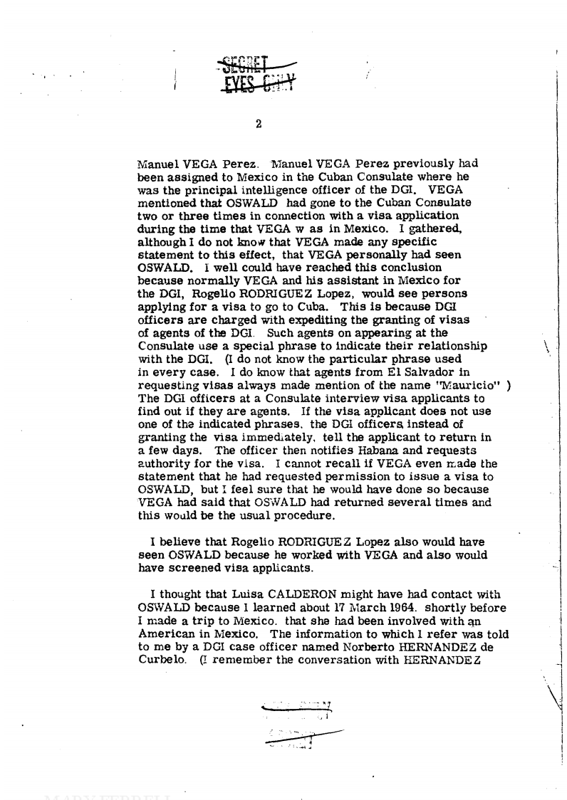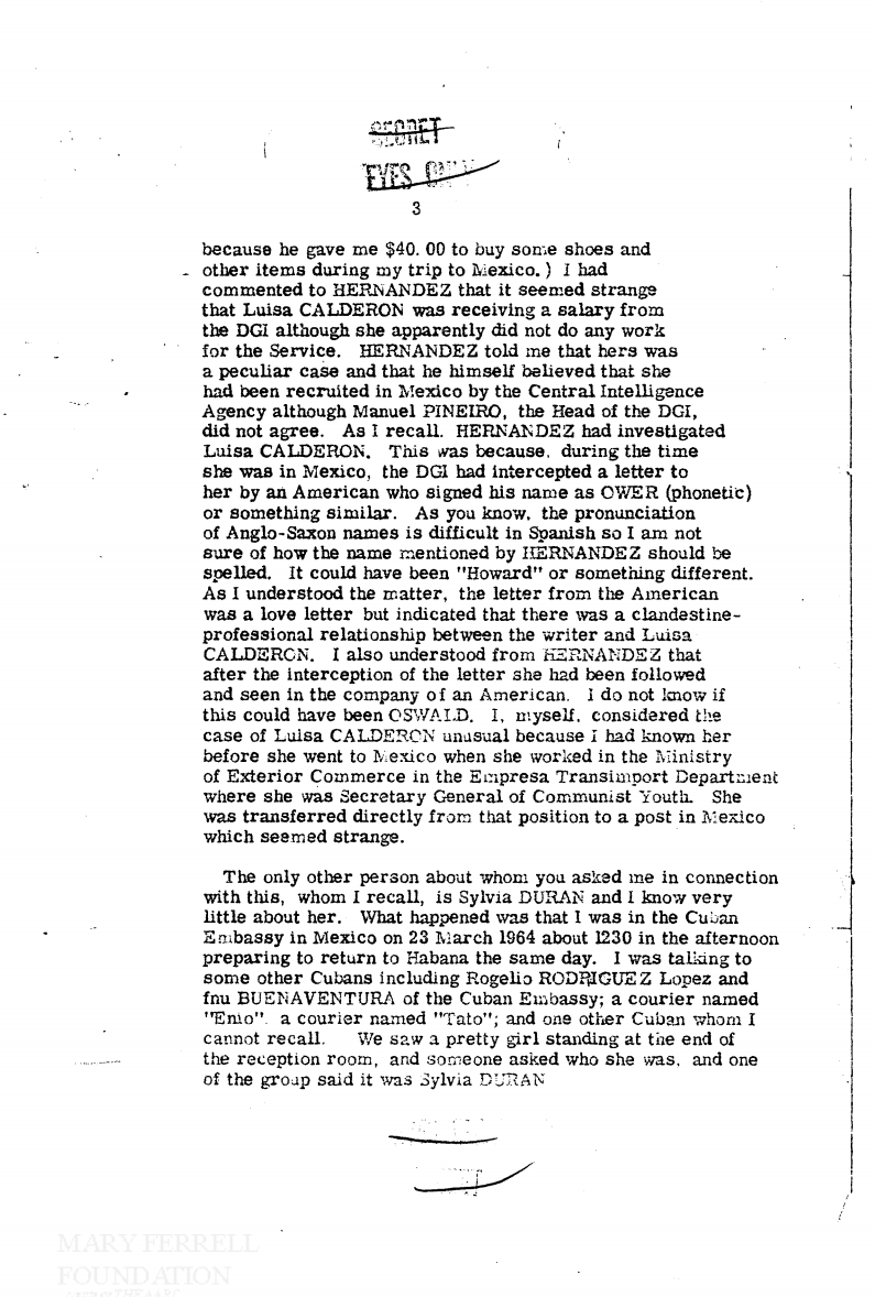 He said that he thought that Luisa Calderon might have had contact with Oswald because he learned about 17 March 1964, that she had been involved with an American in Mexico. (The DGI had intercepted a letter to her by an American who signed his name as Ower, phonetic, or something similar. He said she had been followed and seen in the company of an American. He did not know if this could have been Oswald.)