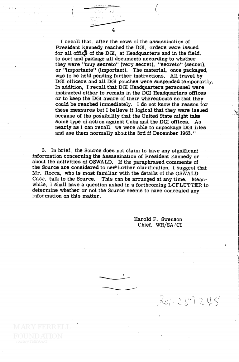 His debriefing (RIF 104-10400-10118) included that "the only possible fabrication known by this source was the specific denial by Fidel Castro on a television program [November 23, 1963], of any Cuban knowledge of Oswald." For turning the possible fabrication into evidence, Dr. Latell swallows AMMUG-1, saying that the most routine matters at the Cuban diplomatic compound in Mexico City were reported directly to Castro. This author begs to disagree. Neither Castro nor any other Chief of Government has time for being informed about visa applications or nasty applicants.